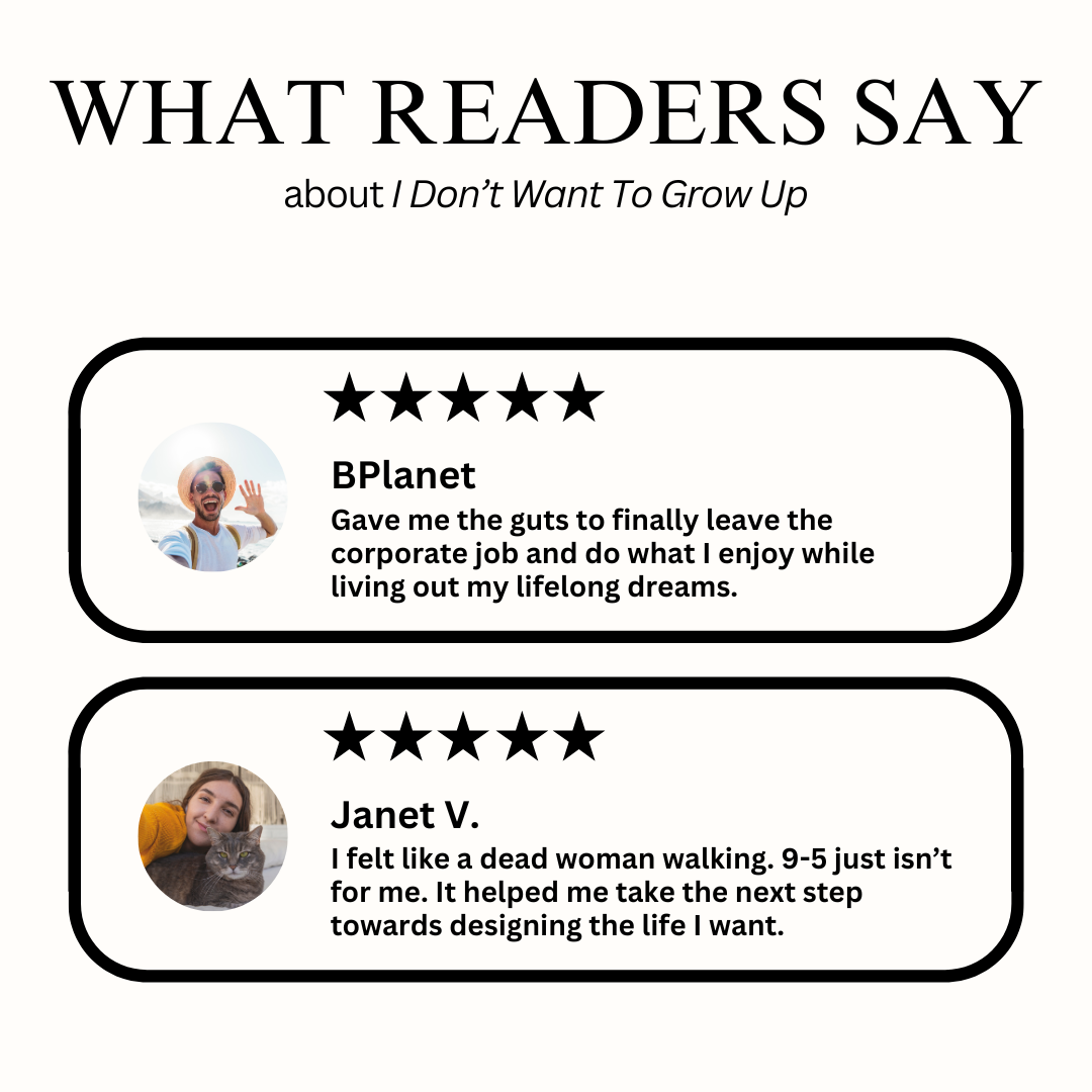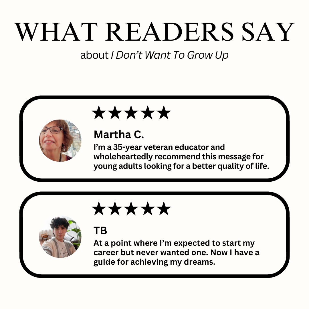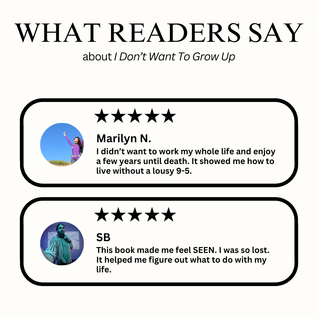 I Don’t Want To Grow Up is a guide for those who question conventional career wisdom and feel called to something different. It challenges the idea that happiness must come from traditional jobs, titles, and predictable routines—and offers a new way of thinking about work, money, and freedom.